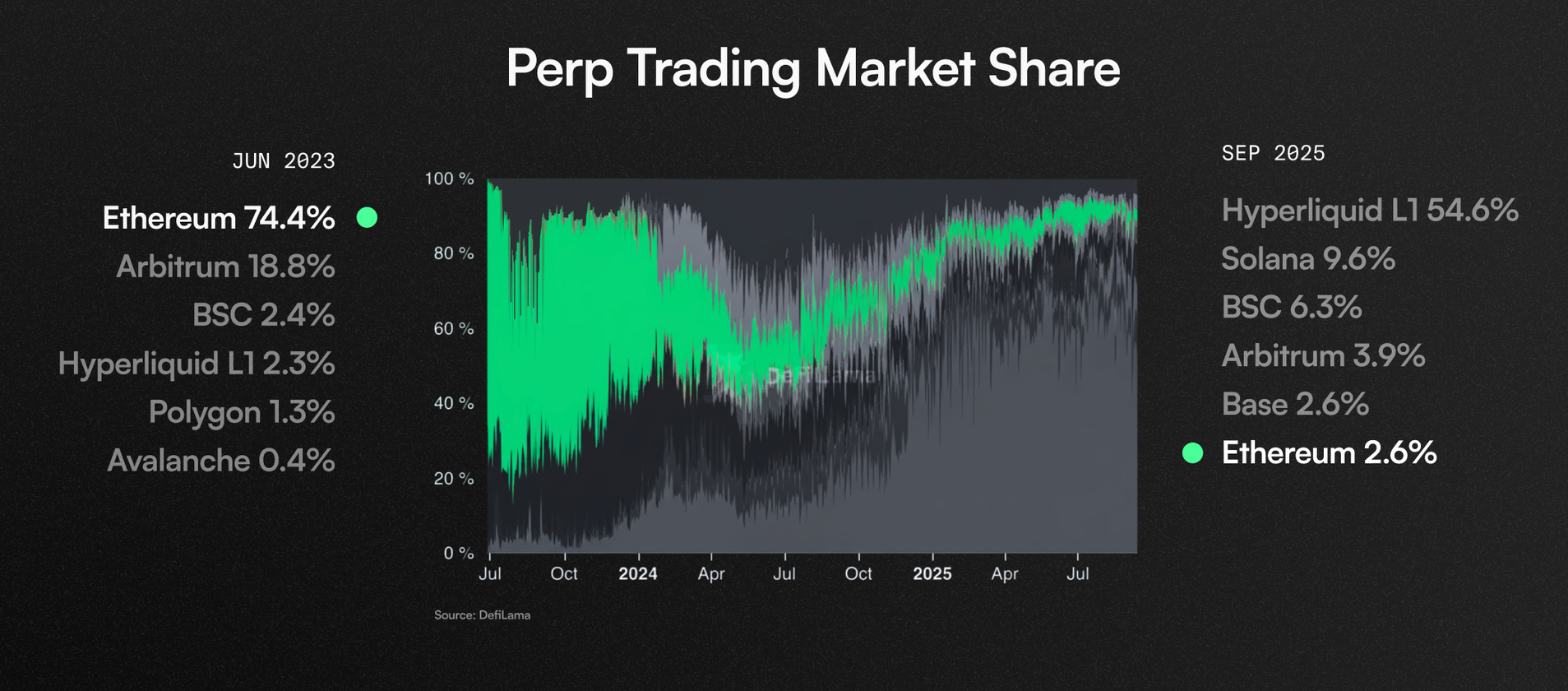 As an example, in 2024–2025, non-Ethereum ecosystems have frequently captured 40–60% of total on-chain perpetual trading volume, with some specialized chains individually exceeding Ethereum L1 and L2 combined in monthly perp volume.